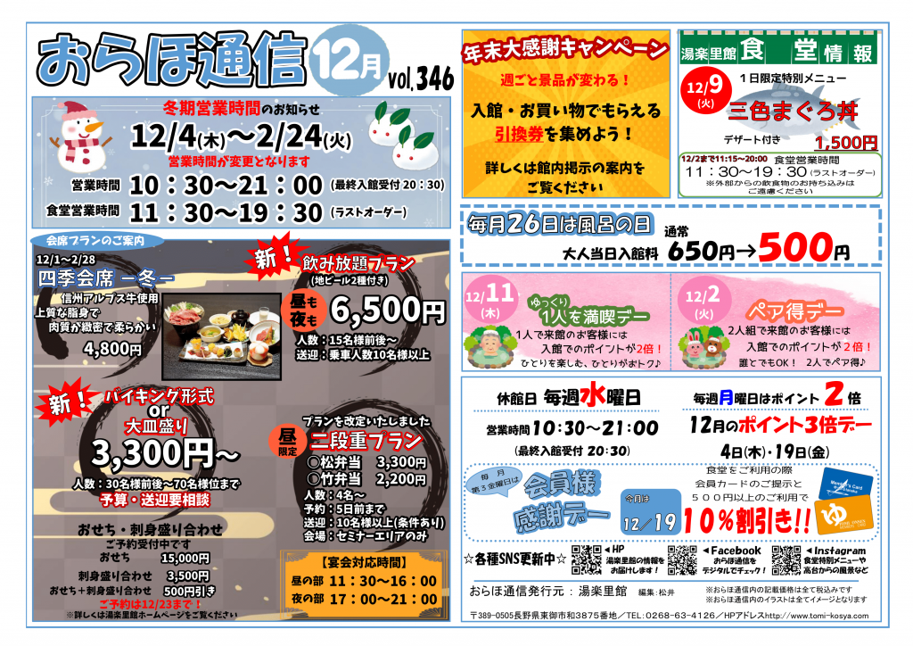 冬季営業時間 10:30 ~ 21:00(最終受付20:30)