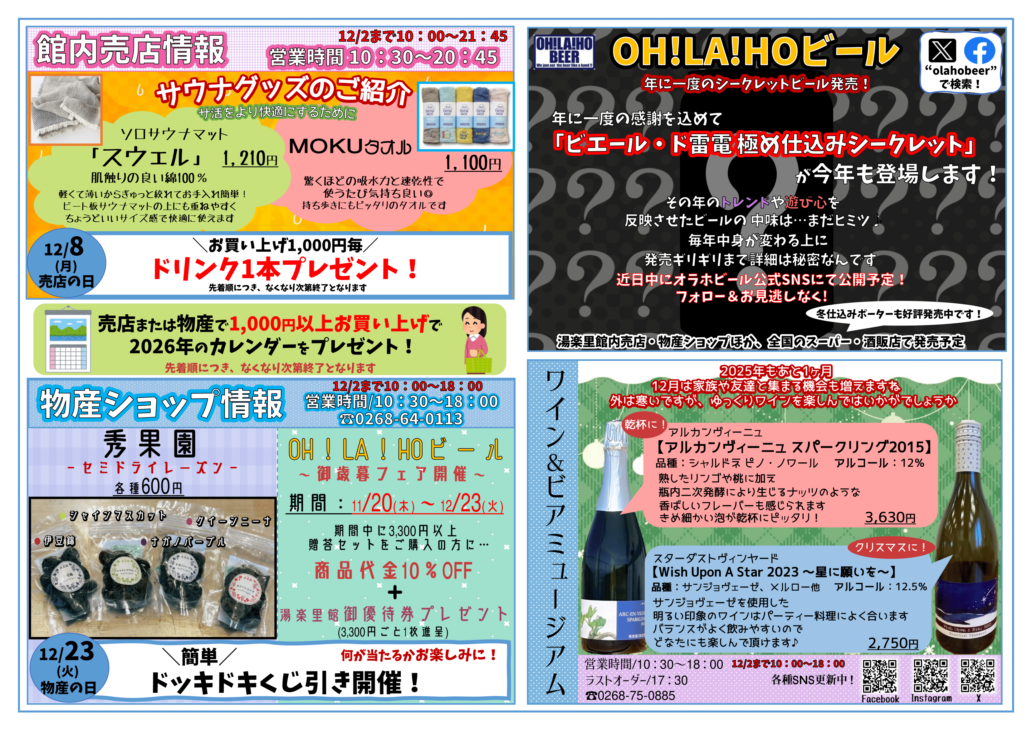 敷地内には、温泉施設「湯楽里館」の館内に「物産ショップ」・「ワイン&ビアミュージアム」